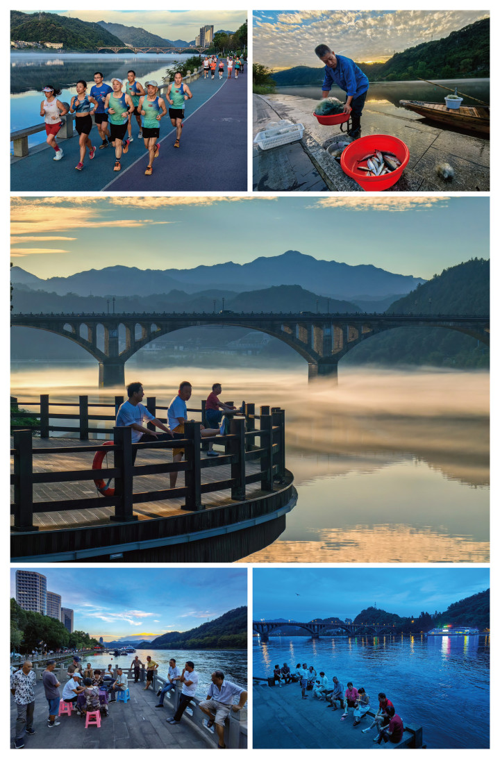 伴随着城市的有机更新,人们与水也有了新的相处方式。比如黄兆钧的作品《新安江畔》,记录下的就是一天中新安江边形形色色的人们。有人跑步运动,有人驻足观景,不同的群体都能在这片“水清、风凉、雾奇”的地方找到自己的“节奏”。