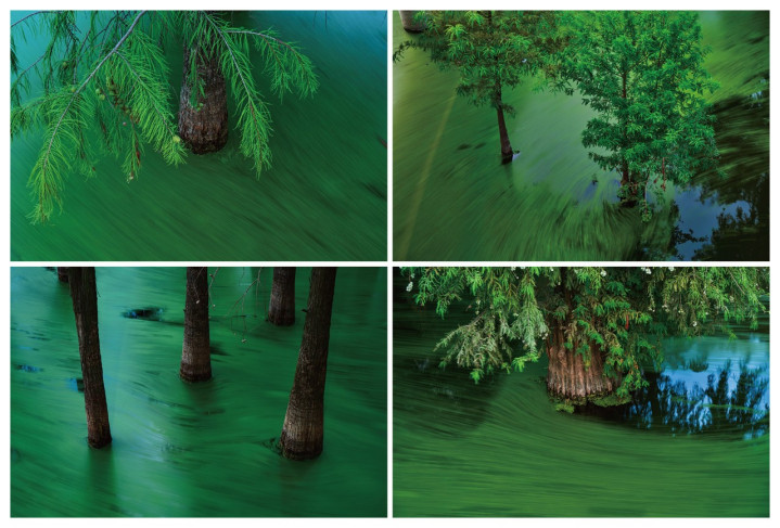 “傍晚6点36分,我在临安青山湖架好相机,用20-60秒的慢门拍摄。彼时天光柔和,水流在长时间曝光下,如丝缎般晕染开,化作温润的绿绸,缠绕着池杉树干。原本灵动的水波被定格成绵密的绿浪,池杉则如沉稳的舞者,在这绿浪间伫立,静谧又富有韵律,仿佛时间都在此刻慢了下来,将青山湖独有的清幽与诗意,都锁进了照片里。”